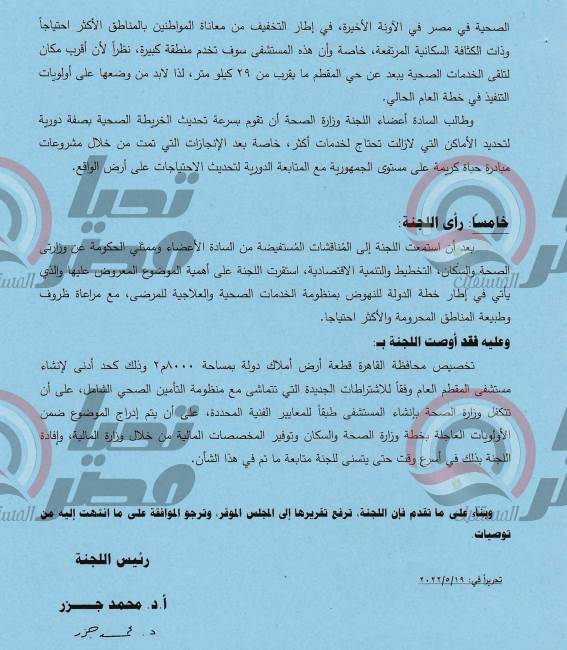 واستقرت اللجنة على أهمية الموضوع المعروض عليها والذي يأتي في إطار خطة الدولة للنهوض بمنظومة الخدمات الصحية والعلاجية للمرضى، مع مراعاة ظروف وطبيعة المناطق المحرومة والأكثر احتياجا.