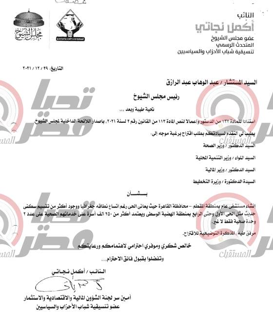 مجلس الشيوخ يوصي بإنشاء مستشفي عام بالمقطم بناء على مقترح النائب اكمل نجاتي