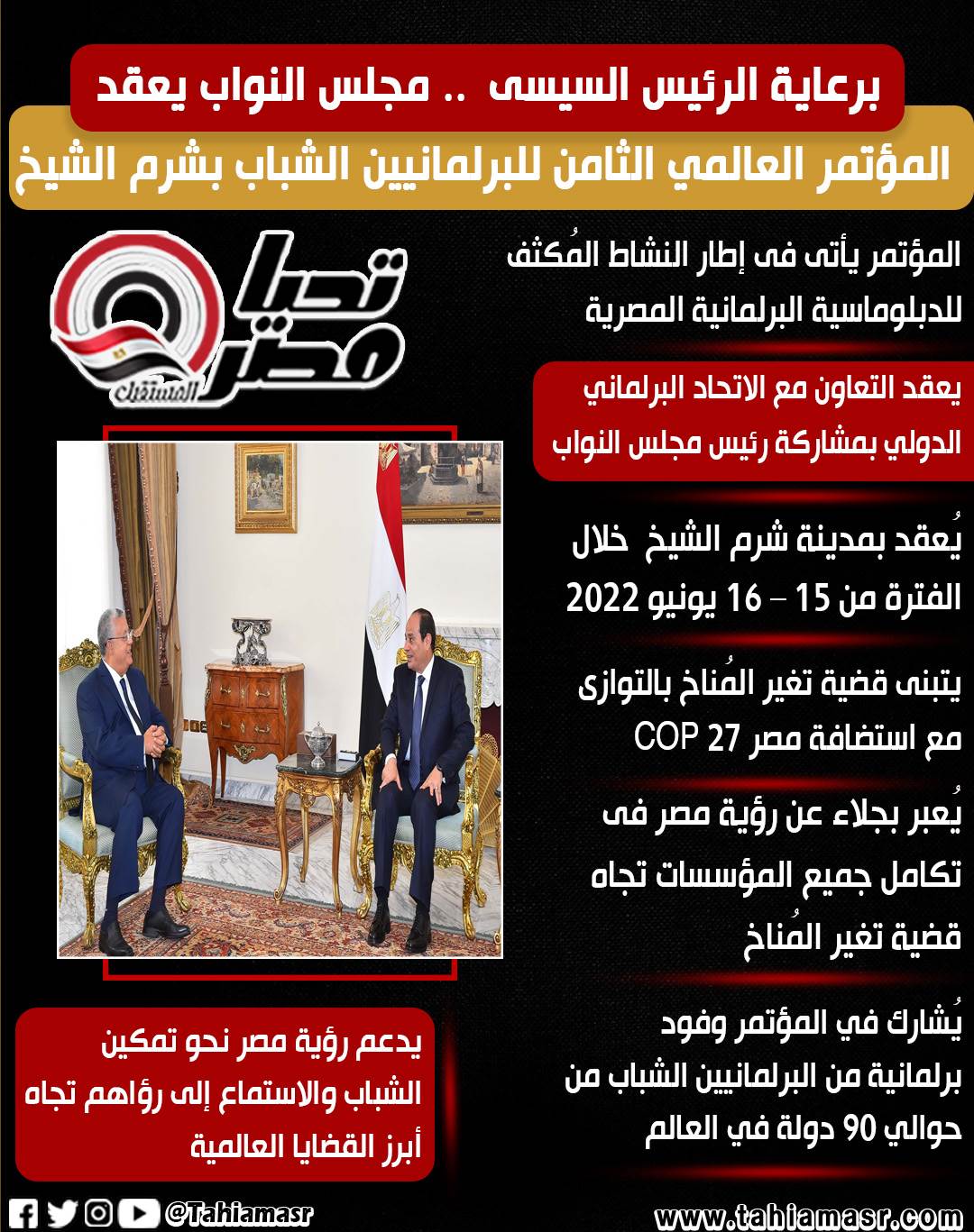 يُنظم مجلس النواب المصري بالتعاون مع الاتحاد البرلماني الدولي وتحت رعاية الرئيس عبدالفتاح السيسي رئيس الجمهورية وبمشاركة المستشار الدكتور حنفي جبالي رئيس مجلس النواب أعمال المؤتمر العالمي الثامن للبرلمانيين الشباب، والذي سيُعقد بمدينة شرم الشيخ، خلال الفترة من 15 – 16 يونيو 2022، بحضور شخصيات إقليمية ودولية رفيعة المستوى في إطار النشاط المُكثف للدبلوماسية البرلمانية المصرية في كافة المحافل الدولية والإقليمية>