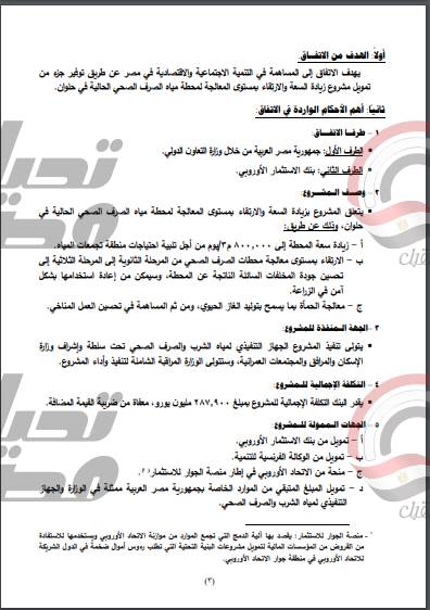 ويهدف الاتفاق إلى المساهمة فى التنمية الاجتماعية والاقتصادية فى مصر عن طريق توفير جزء من تمويل مشروع زيادة السعة والارتقاء بمستوى المعالجة لمحطة مياه الصرف الحالية بحلوان.