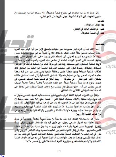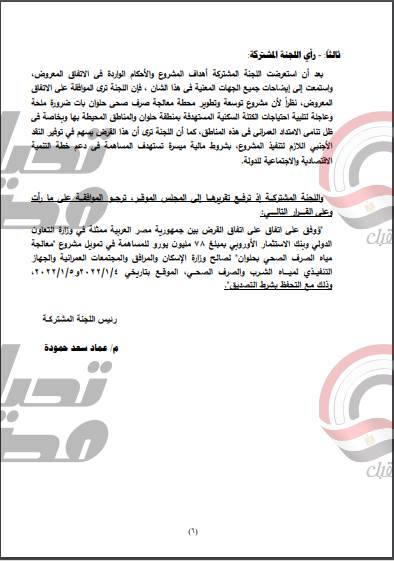 استعرضت اللجنة المشتركة أهداف المشروع والأحكام الواردة في الاتفاق المعروض، واستمعت إلى إيضاحات جميع الجهات المعنية في هذا الشان ، فإن اللجنة ترى الموافقة على الاتفاق المعروض، نظراً لأن مشروع توسعة وتطوير محطة معالجة صرف صحى حلوان بات ضرورة ملحة وعاجلة لتلبية احتياجات الكتلة السكنية المستهدفة بمنطقة حلوان والمناطق المحيطة بها وبخاصة في ظل تنامي الامتداد العمراني في هذه المناطق، كما أن اللجنة ترى أن هذا القرض يسهم في توفير النقد الأجنبي اللازم لتنفيذ المشروع، بشروط مالية ميسرة تستهدف المساهمة في دعم خطة التنمية الاقتصادية والاجتماعية للدولة.