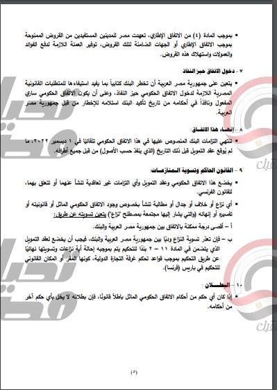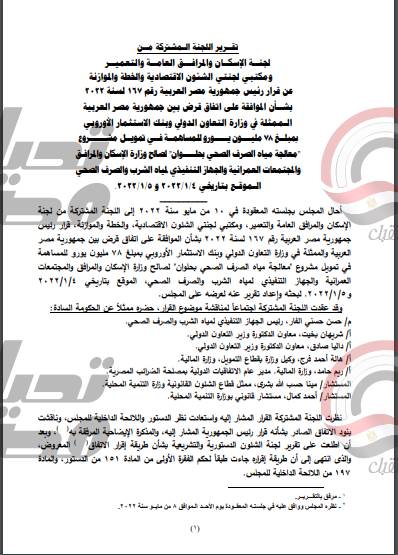 وافقت على اتفاق القرض بين جمهورية مصر العربية ممثلة في وزارة التعاون الدولي وبنك الاستثمار الأوروبي بمبلغ 78 مليون يورو للمساهمة في تمويل مشروع "معالجة مياه الصرف الصحي بحلوان" لصالح وزارة الإسكان والمرافق والمجتمعات العمرانية والجهاز التنفيذي لمياه الشرب والصرف الصحي، الموقع بتاريخي ۲۰۲۲/١/٤و۲۰۲۲/۱/۵، وذلك مع التحفظ بشرط التصديق".
