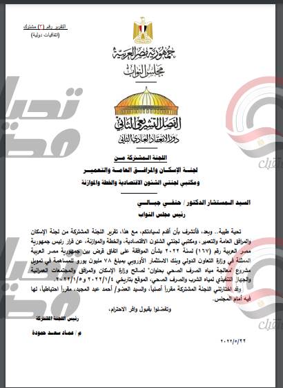 تشهد الجلسة العامة لمجلس النواب، برئاسة المستشار حنفي جبالي، الثلاثاء المقبل مناقشة تقرير اللجنة المشتركة مـن لجنـة الإسكان والمرافق العامـة والتعميـر، برئاسة النائب عماد سعد حمودة، ومكتبي لجنتي الشئون الاقتصادية والخطة والموازنة عن قرار رئيس جمهورية مصر العربية رقم 167 لسنة ٢٠٢٢، بشأن الموافقة على اتفاق قرض بين جمهورية مصر العربية الممثلة في وزارة التعاون الدولي وبنك الاستثمار الأوروبي بمبلغ 78 مليون يورو للمساهمـة فـي تمويـل مشروع "معالجة مياه الصرف الصحي بحلوان" لصالح وزارة الإسكان والمرافق والمجتمعات العمرانية والجهاز التنفيذي لمياه الشرب والصرف الصحي الـمـوقـع بتاريخي ٢٠٢٢/١/٤ ۲۰۲۲/۱/٥.
