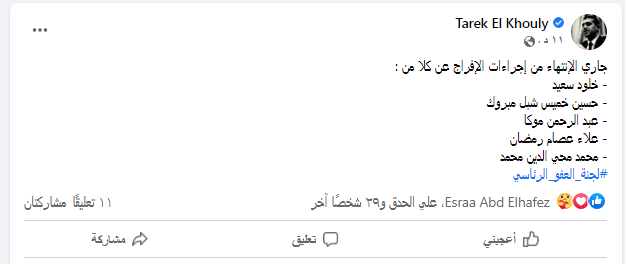 أعلن النائب طارق الخولي، عضو لجنة العلاقات الخارجية بمجلس النواب، عضو لجنة العفو الرئاسي، أنه جاري الإنتهاء من إجراءات الإفراج عن كلا من : - خلود سعيد - حسين خميس شبل مبروك - عبد الرحمن موكا - علاء عصام رمضان - محمد محي الدين محمد