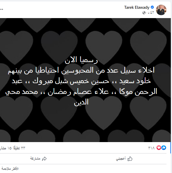 طارق العوضي: رسميا إخلاء سبيل عدد من المحبوسين احتياطيا