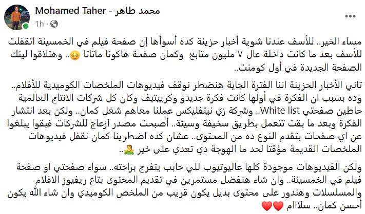 كتب محمد طاهر عبر صفحته الرسمية بموقع التواصل الاجتماعي فيسبوك: “مساء الخير.. للأسف عندنا شوية أخبار حزينة كده أسوأها إن صفحة فيلم في الخمسينة اتقفلت للأسف بعد ما كانت داخلة عال ٧ مليون متابع وكمان صفحة هاكونا ماتاتا.. وهتلاقوا لينك الصفحة الجديدة في أول كومنت”.