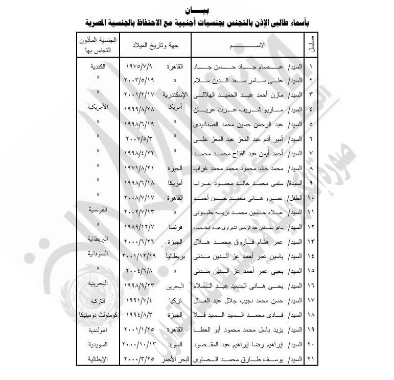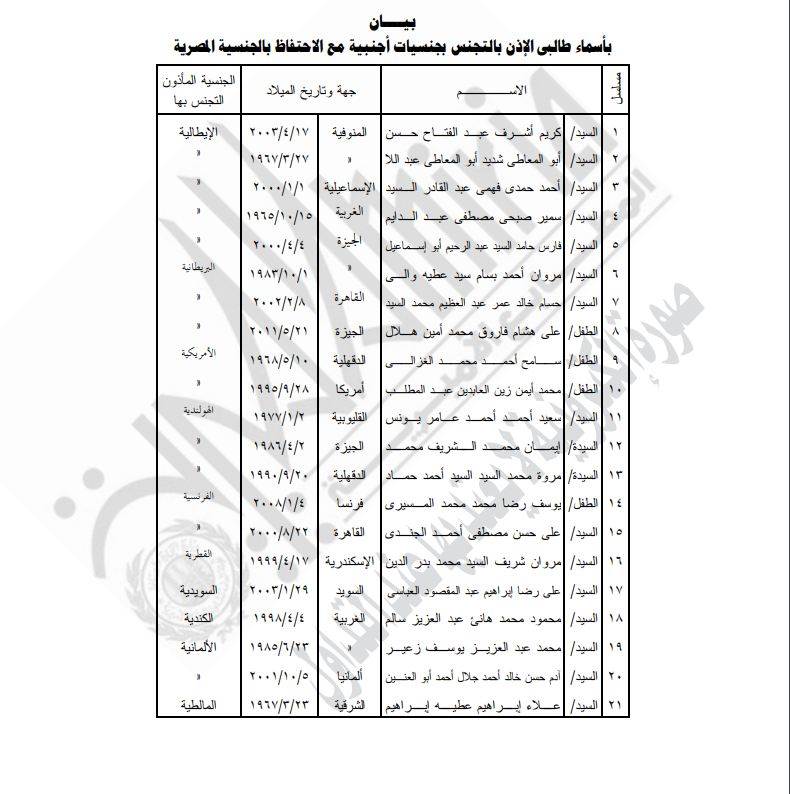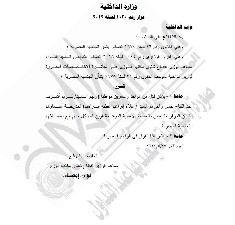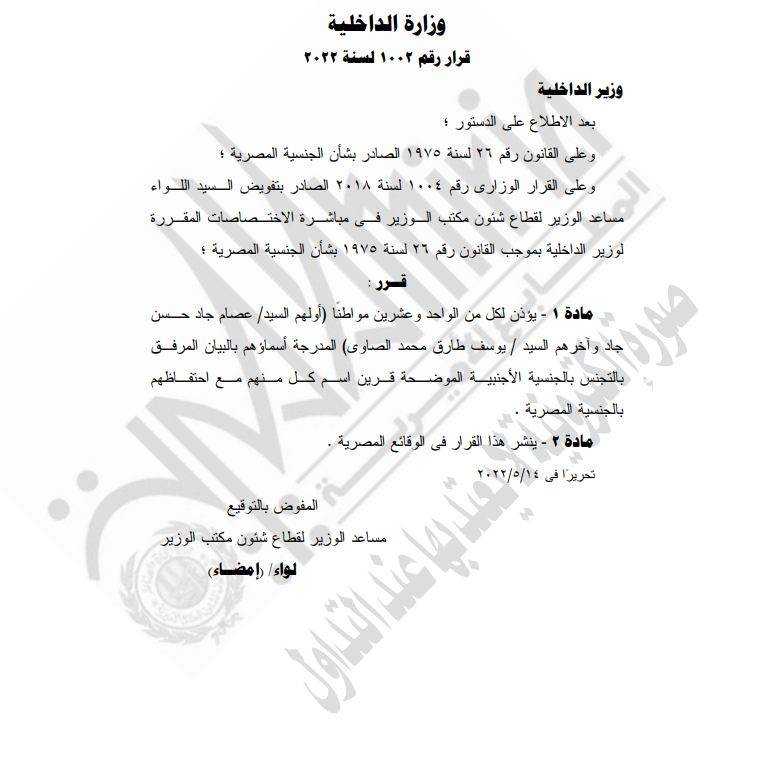 نشرت الجريدة الرسمية قرارى وزير الداخلية اللواء محمود توفيق رقم 1002 و1020 لسنة 2022، بالسماح لـ 42 مواطنا بالتجنس بالجنسية الاجنبية مع احتفاظهم بالجنسية المصرية.