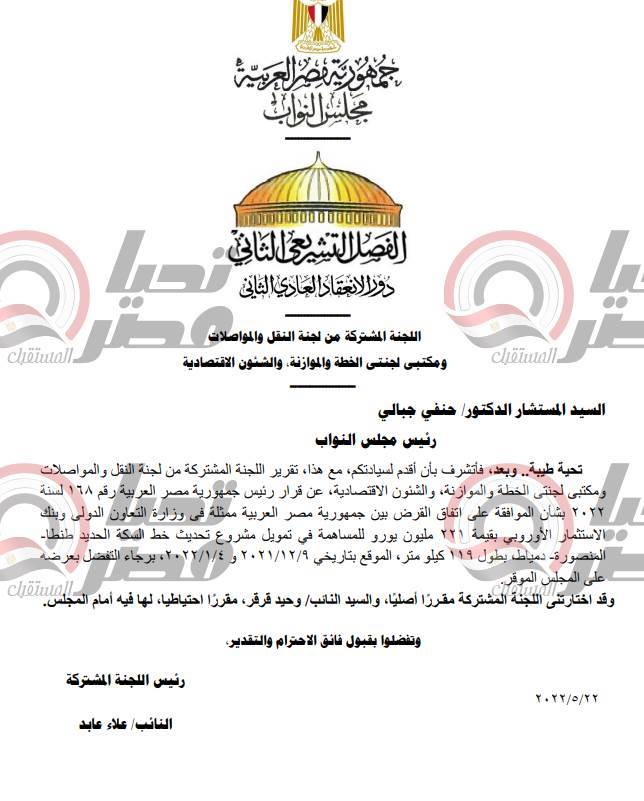«بقيمة 221 مليون يورو».. البرلمان يناقش اليوم اتفاقية قرض بنك الاستثمار الأوروبى لتمويل خط سكة حديد «طنطا - المنصورة – دمياط»