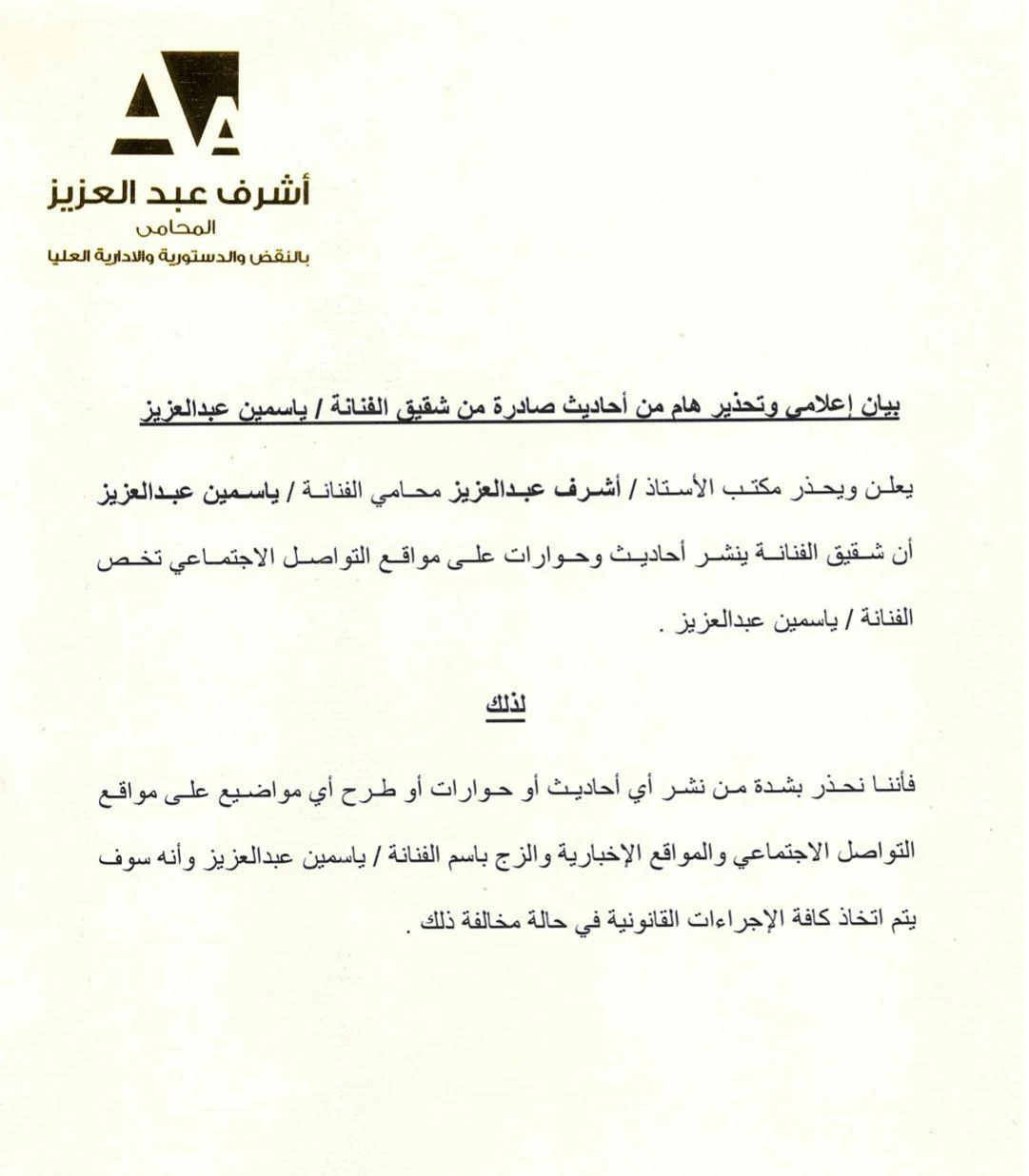 ونص البيان جاء كالتالي: بيان إعلامي وتحذير هام من أحاديث صادرة من شقيق الفنانة ياسمين عبد العزيز، يعلن ويحذر مكتب الأستاذ أشرف عبد العزيز محامي الفنانة ياسمين عبد العزيز، أن شقيق الفنانة ينشر أحاديث وحوارات على مواقع التواصل الإجتماعي تخص الفنانة ياسمين عبد العزيز.
