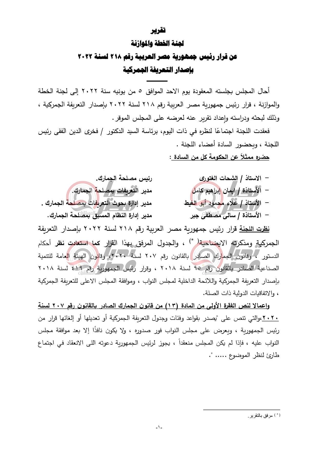 وافق مجلس النواب، برئاسة المستشار الدكتور حنفى جبالى، على قرار رئيس الجمهورية، بإصدار التعريفة الجمركية، حيث قام بعرض تقرير لجنة الخطة النائب ياسر عمر، وكيل لجنة الخطة والموازنة.