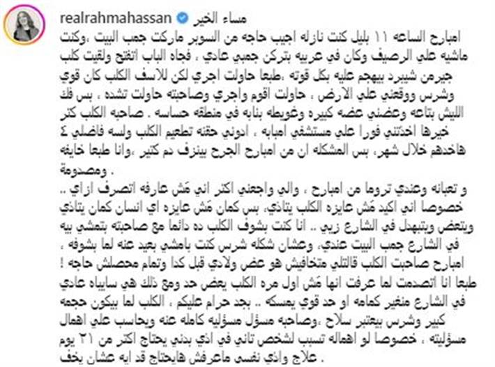 وتابعت الفنانة رحمة حسن: “بجد حرام عليكم ، الكلب لما بيكون حجمه كبير وشرس بيعتبر سلاح ، وصاحبه مسؤل مسؤليه كامله عنه ويحاسب علي اهمال مسؤليته ، خصوصا لو اهماله تسبب لشخص تاني في اذي بدني يحتاج اكتر من ٢١ يوم علاج واذي نفسي ماعرفش هايحتاج قد ايه عشان يخف".