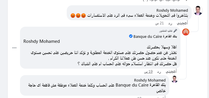 نشر عميل بنك القاهرة عبر صفحة الموقع على "فيسبوك"، : "بتتاخروا فى التحويلات وخدمة العملاء سيئة فى الرد على الاستفسارات".