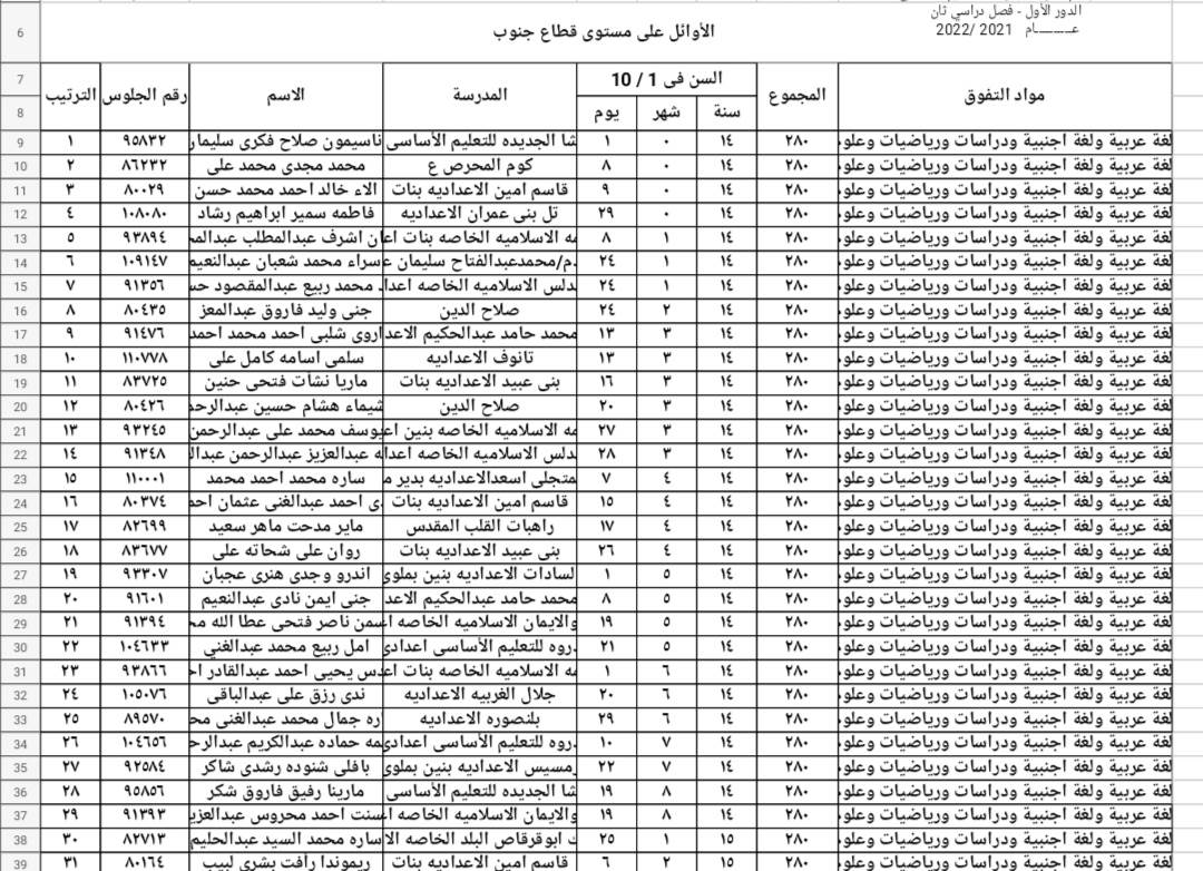 وأوضح وكيل وزارة التربية والتعليم، أن عدد أوائل الشهادة الإعدادية موزعين على ثلاث قطاعات رئيسية وهم : قطاع جنوب وعدد الطلاب الأوائل به 31 طالب وطالبة، بينما في قطاع وسط فعدد الطلاب الأوائل به 45 طالب وطالبة، أما في قطاع شمال فعدد الطلاب الأوائل به 50 طالب وطالبة.