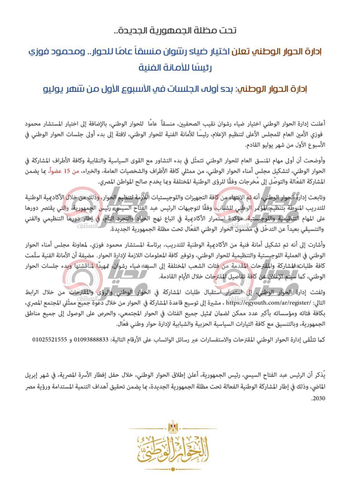 يذكر أن الرئيس عبد الفتاح السيسي، رئيس الجمهورية، أعلن إطلاق الحوار الوطني، خلال حفل إفطار الأسرة المصرية، في شهر إبريل الماضي، وذلك في إطار المشاركة الوطنية الفعالة تحت مظلة الجمهورية الجديدة، ما يضمن تحقيق أهداف التنمية المستدامة ورؤية مصر