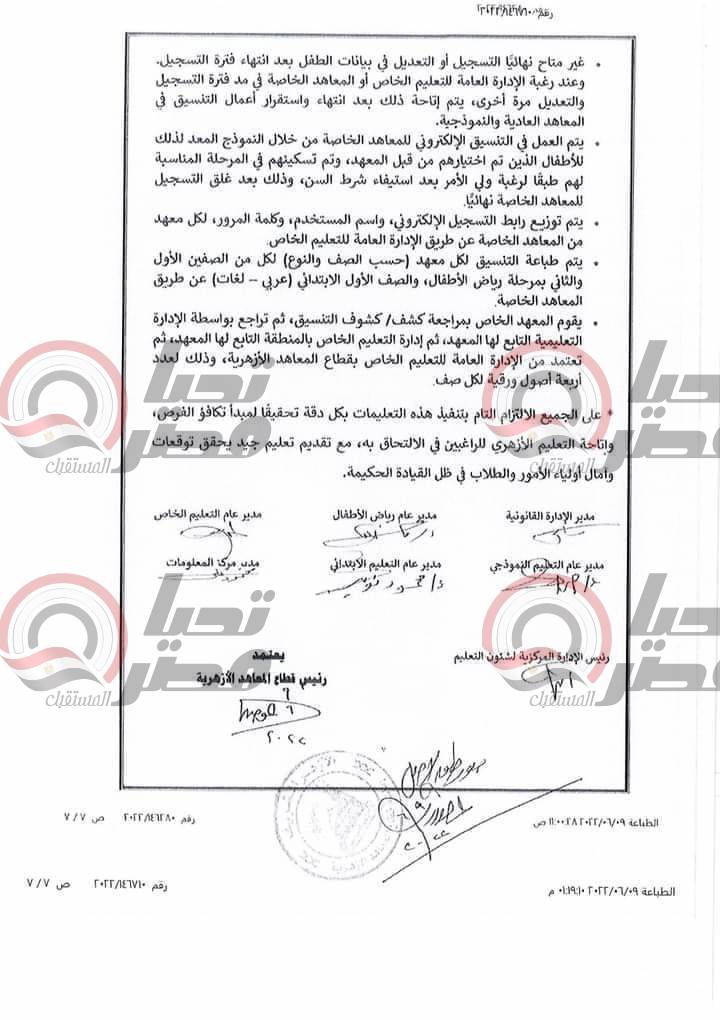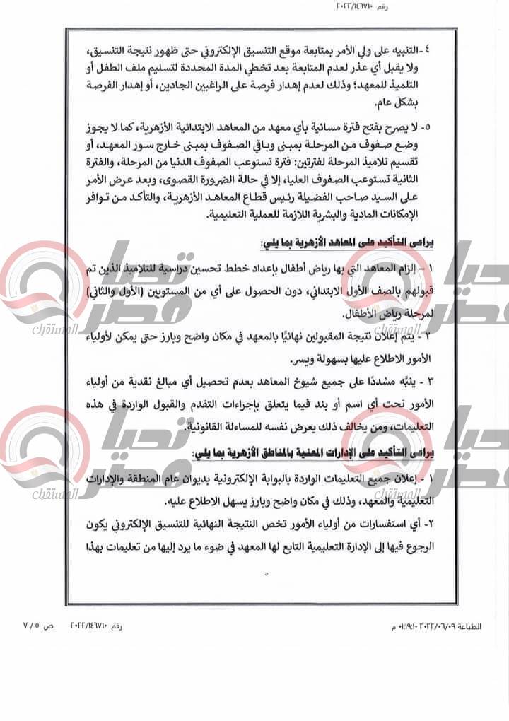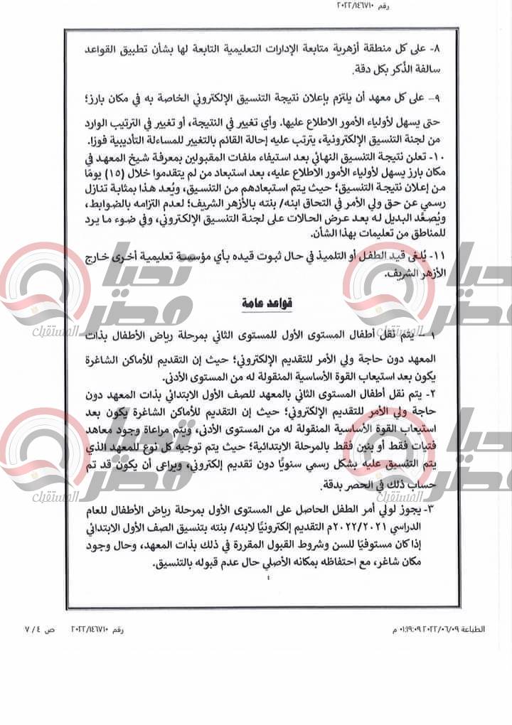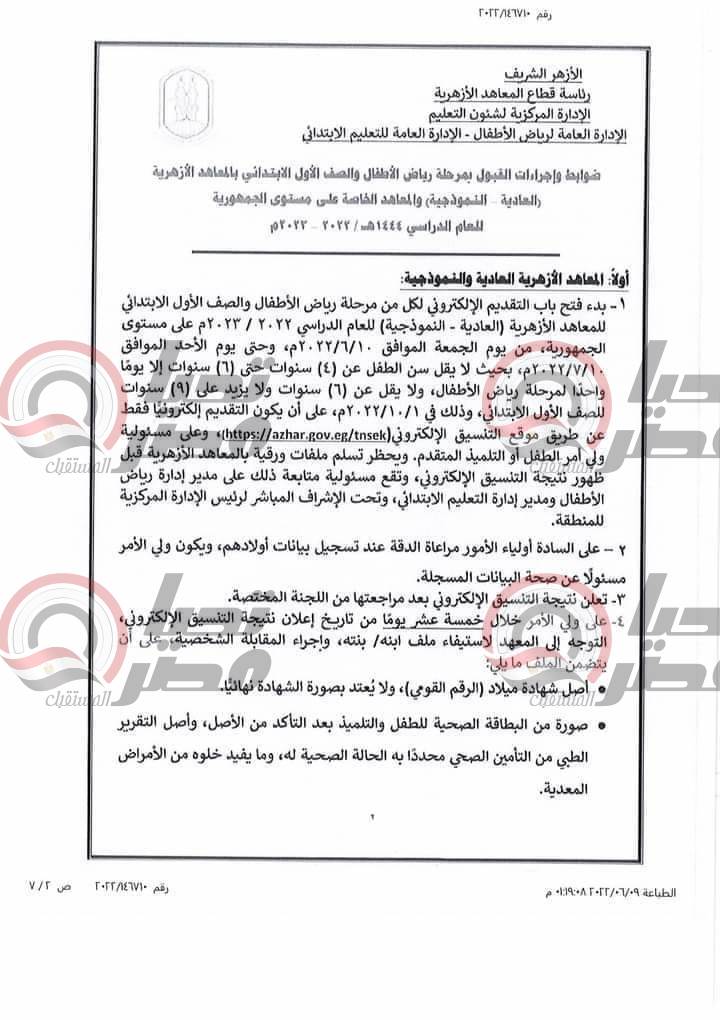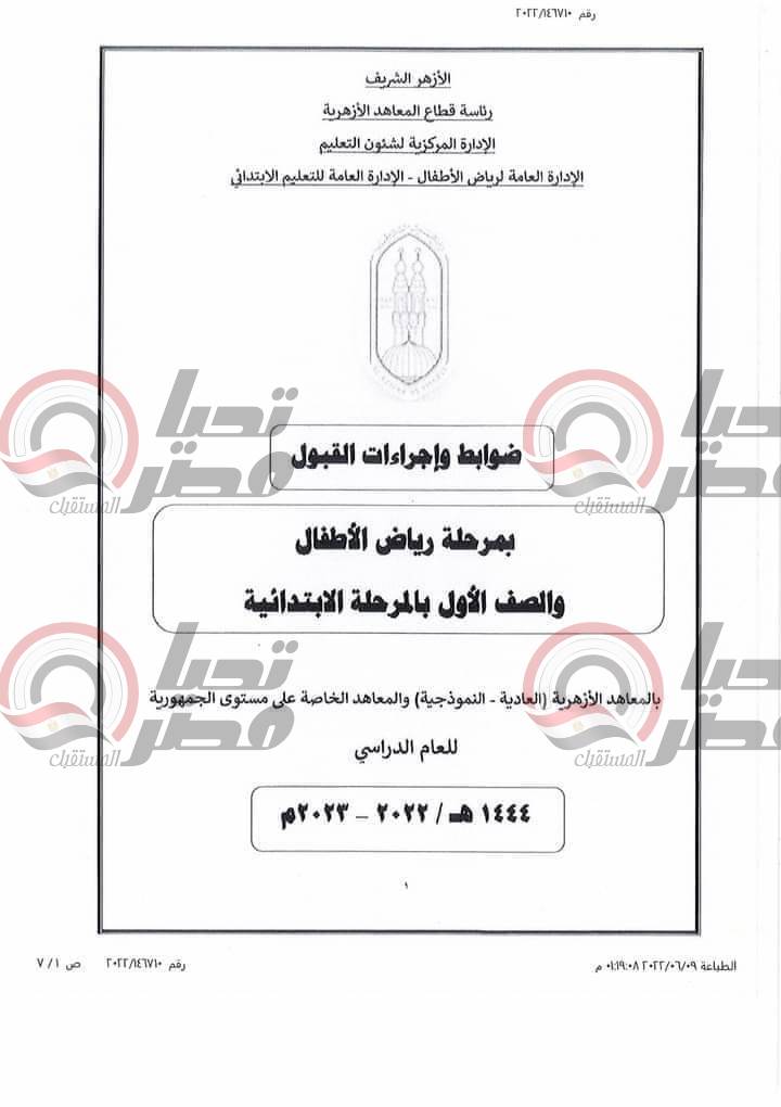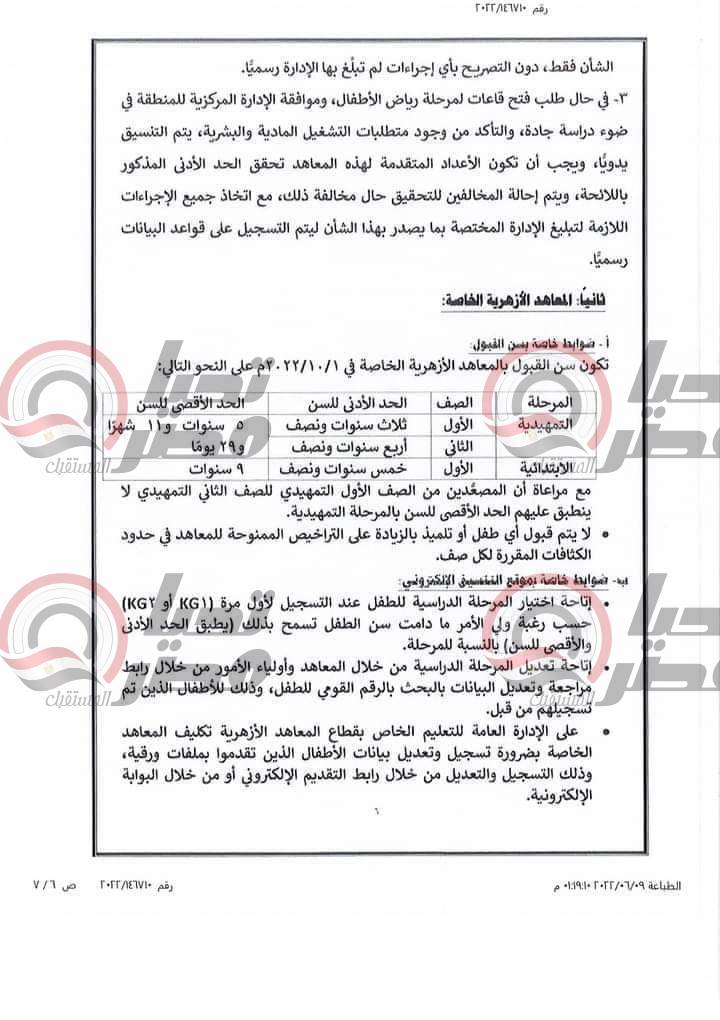 - يجوز النزول بسن القبول بمرحلة رياض الأطفال في حدود (ستة أشهر)، والنزول بسن القبول بالصف الأول الابتدائي في حدود (ستة أشهر)، وذلك بخصوص المعاهد الأزهرية التي تتوافر بها هذه المرحلة، والتي لم تستوف كثافة الفصول بها، وذلك ممن توافرت في حقهم شروط القبول بهذه المرحلة وحتى اكتمال الكثافة بالمعاهد النموذجية، ويشترط توقيع ولي الأمر على إقرار بعدم التحويل من التعليم الأزهري إلى التعليم العام خلال مراحل الدراسة.