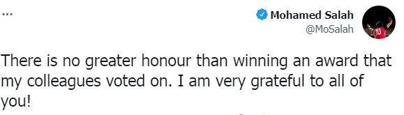 وغرد صلاح عبر حسابه الرسمي على موقع التدوينات الصغيرة تويتر قائلا:"لا يوجد شرف أكبر من الفوز بجائزة صوت عليها زملائي اللاعبين.. أنا ممتن جدا لكم جميعا!".