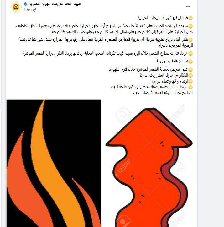 وأعلنت هيئة الأرصاد الجوية عن حالة الطقس غدا السبت، من خلال صفحتها على موقع التواصل الاجتماعي "فيس بوك"، والذي من المتوقع أن يكون طقس شديد الحرارة وقد يتجاوز الـ 40 درجة على بعض المناطق في جمهورية مصر العربية.