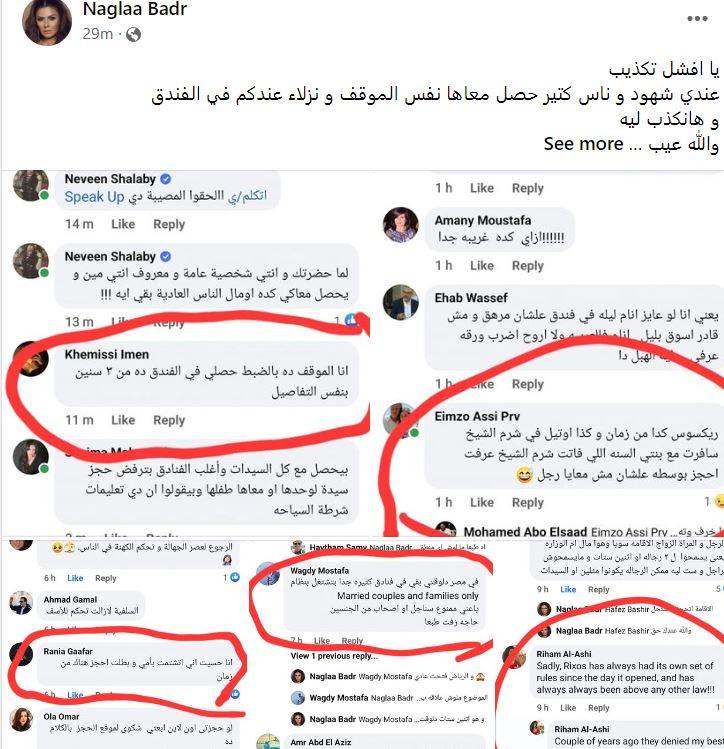وكانت قبلها بساعات قليلة كتبت عبر صفحتها: “في فندق بعد ما خلصنا إجراءات الإقامة فيه لمهمة عمل في الساحل الشمالي، ومضينا وقعدنا ساعة في إنتظار الغرف، وبعد كده اعتذروا لعدم قبول إقامة سناجل يعني الراجل يروح بزوجته والست تروح بزوجها”.