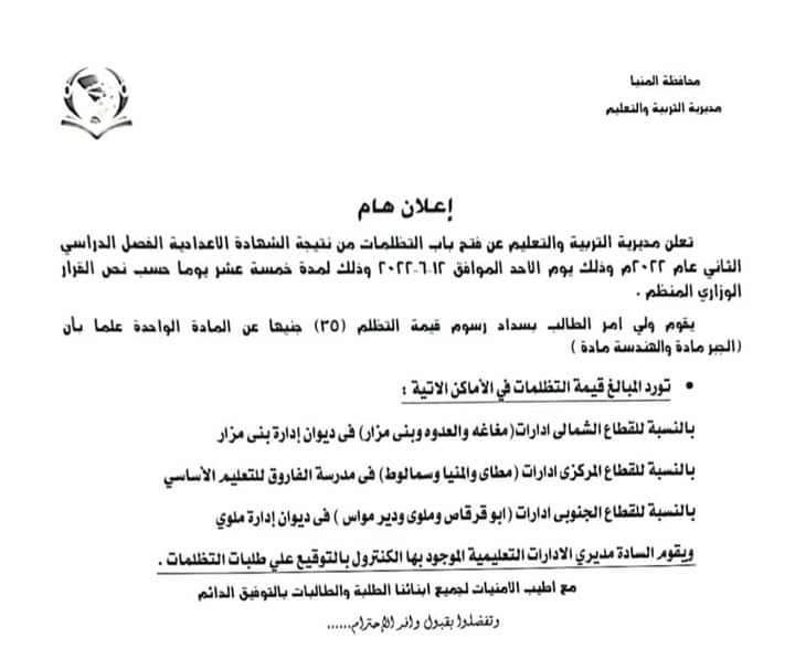 اليوم الأحد فتح باب تظلمات الشهادة الإعدادية بالمنيا.. تعرف على التفاصيل