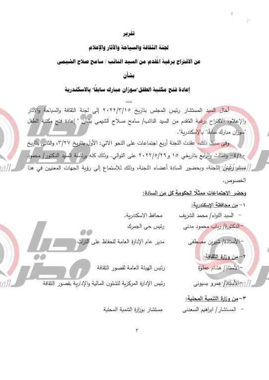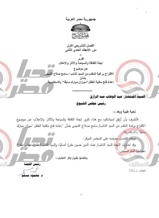 شهدت الجلسة العامة لمجلس الشيوخ اليوم، برئاسة المستشار عبد الوهاب عبد الرازق، إحالة تقرير لجنة الثقافة والسياحة والاثار والإعلام، عن الاقتراح برغبة المقد من النائب سامح صلاح الشيمي، عضو مجلس الشيوخ لإعادة فتح مكتبة الطفل سوزان مبارك بالإسكندرية، للحكومة لاتخاذ اللازم بشأنة.