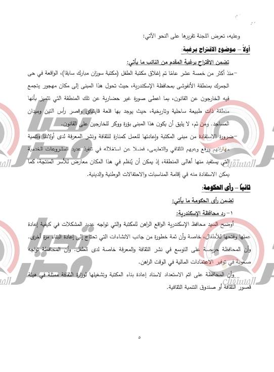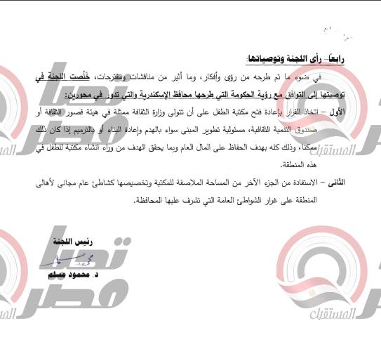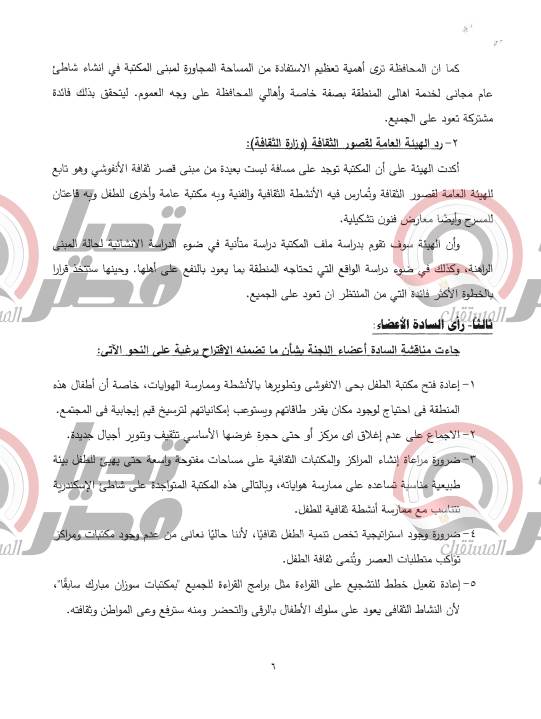 الأول – اتخاذ القرار بإعادة فتح مكتبة الطفل على أن تتولى وزارة الثقافة ممثلة في هيئة قصور الثقافة أو صندوق التنمية الثقافية ، مسئولية تطوير المبنى سواء بالهدم وإعادة البناء أو بالترميم إذا كان ذلك ممكنا ، وذلك كله بهدف الحفاظ على المال العام وبما يحقق الهدف من وراء انشاء مكتبة للطفل في هذه المنطقة .