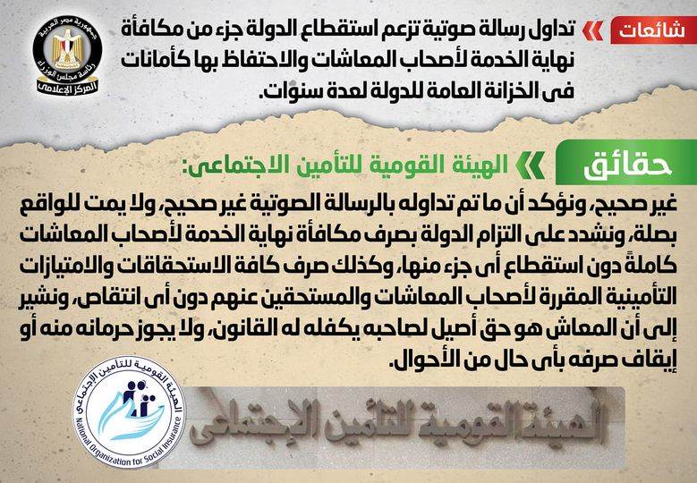 وتواصل المركز الإعلامي مع الهيئة القومية للتأمين الاجتماعي، والتي نفت تلك الأنباء، مُؤكدةً أنه لا صحة لاستقطاع أي جزء من مكافأة نهاية الخدمة لأصحاب المعاشات أو الاحتفاظ بها كأمانات في الخزانة العامة للدولة لعدة سنوات، وأن ما تم تداوله بالرسالة الصوتية غير صحيح ولا يمت للواقع بصلة، مُشددةً على التزام الدولة بصرف مكافأة نهاية الخدمة لأصحاب المعاشات كاملةً دون استقطاع أي جزء منها، وكذلك صرف كافة الاستحقاقات والامتيازات التأمينية المقررة لأصحاب المعاشات والمستحقين عنهم دون أي انتقاص، مشيرةً إلى أن المعاش هو حق أصيل لصاحبه يكفله له القانون، ولا يجوز حرمانه منه أو إيقاف صرفه بأي حال من الأحوال.