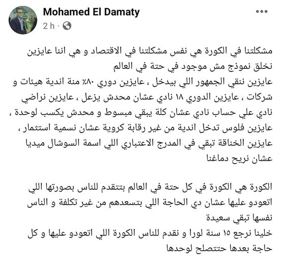 وقال محمد الدماطي عضو مجلس إدارة النادي الأهلي، من خلال بوست نشره عبر صفحته الخاصة بموقع التواصل الاجتماعي "فيس بوك" " مشكلتنا في الكورة زي مشكلتنا في الاقتصاد، وهي إننا عايزين نخلق نموذج مش موجود في حتة في العالم".