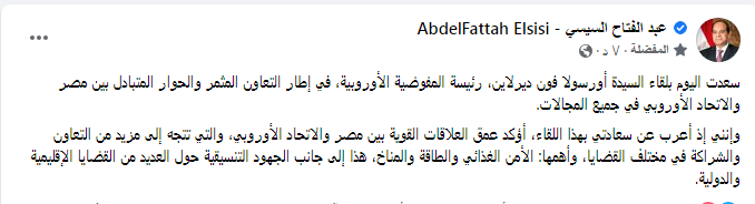 وكتب الرئيس عبد الفتاح السيسي، على صفحته على موقع التواصل الاجتماعي «فيس بوك»: “سعدت اليوم بلقاء أورسولا فون ديرلاين، رئيسة المفوضية الأوروبية، في إطار التعاون المثمر والحوار المتبادل بين مصر والاتحاد الأوروبي في جميع المجالات».