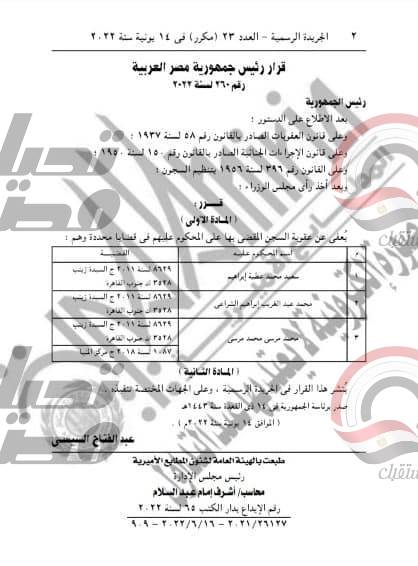 وتضمن القرار العفو عن كل من سعيد محمد عطية إبراهيم ، محمد عبد الغريب إبراهيم الشراعى ، محمد مرسى محمد مرسى.