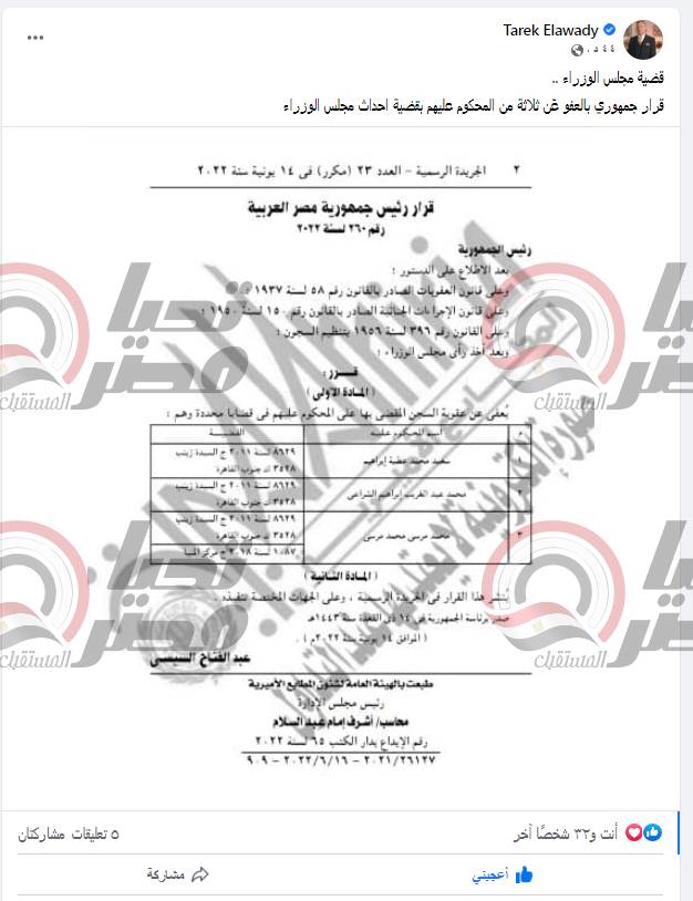 نشر المحامى وعضو لجنة العفو الرئاسي طارق العوضى، قرارا جمهوريا بالعفو عن ثلاثة من المحكوم عليهم بقضية أحداث مجلس الوزراء، على صفحته الرسمية بموقع التواصل الاجتماعي فيسبوك.