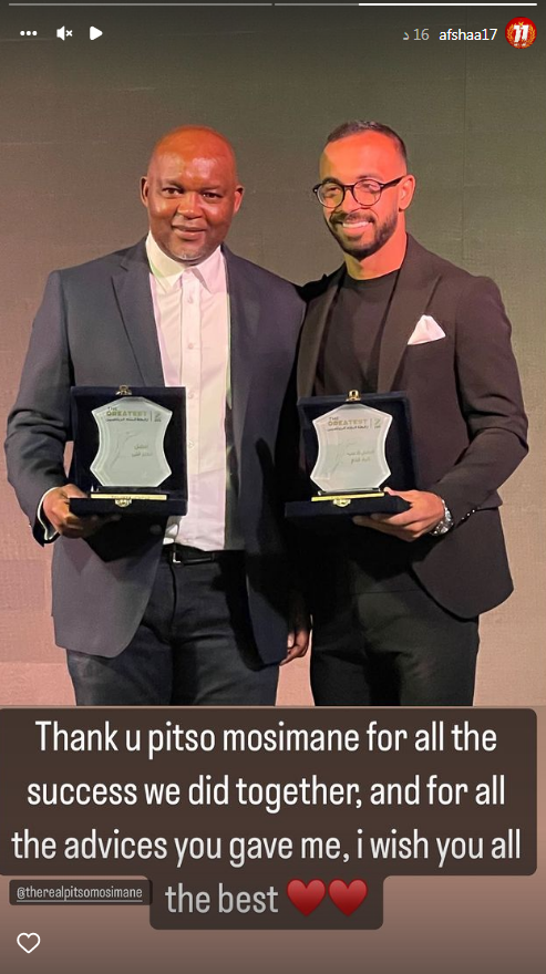 وكتب أفشة"شكرا موسيماني على كل النجاحات التي حققناها سويا وعلى كل نصائحك لي اتمنى لك كل التوفيق."