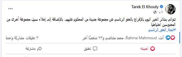 أعلن النائب طارق الخولي، عضو لجنة اعلاقات الخارجية بمجلس النواب عن تنسيقية شباب الأحزاب والسياسيين، عضو لجنة العفو الرئاسي، اليوم، عن خروج مجموعة جديدة بقرارات عفو رئاسي من المحكوم عليهم، ومجموعة يتم اخلاء سبيلهم من الحبس الاحتياطي.