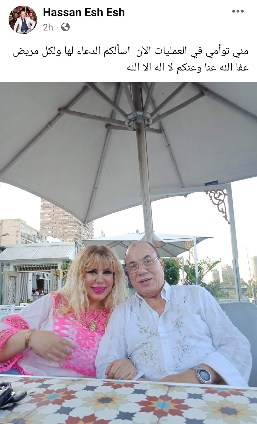 وكتب حسن إش إش عبر حسابه الشخصي بموقع التواصل الإجتماعي فيسبوك: منى توأمي في العمليات الآن.. أسألكم بالدعاء لها ولكل مريض.. عفا الله عنا وعنكم.. لا إله إلا الله.
