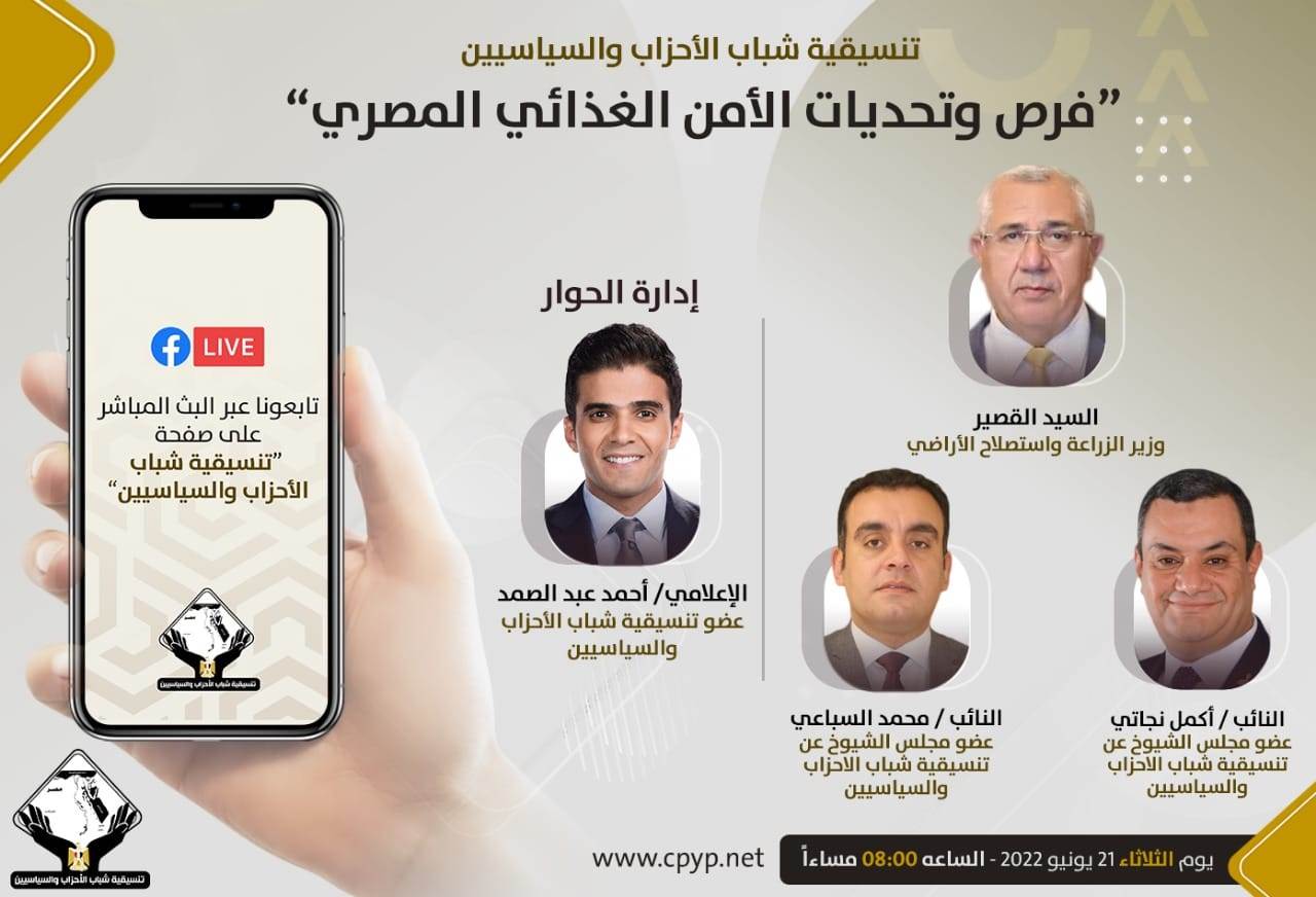 ومن المقرر أن تعقد التنسيقية، فى الـ 8 مساء اليوم، صالونا ثقافيا حواريا ضمن فاعليات حملة سوا هانعدي بعنوان «فرص وتحديات الأمن الغذائي المصري»، بحضور وزير الزراعة السيد القصير. ويدير الحوار الإعلامي أحمد عبد الصمد، عضو التنسيقية، ويشارك في الصالون كل من النائب اكمل نجاتي،وكيل اللجنة الاقتصادية، والنائب محمد السباعي،أمين سر لجنة الزراعة والري، اعضاء مجلس الشيوخ عن تنسيقية شباب الأحزاب والسياسيين.