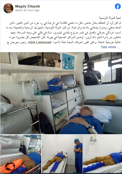 وتابع الناقد الفني مجدي الطيب: “بجهد مشكور من إدارة فندق بالما أزور، لإحدى المراكز الصحية في چربة، لكن التشخيص أقر بضروة اجراء عملية جراحية عاجلة”.