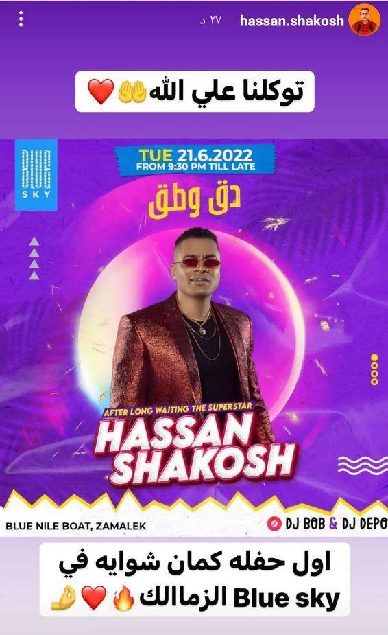شارك مطرب المهرجانات حسن شاكوش متابعيه وجمهوره احتفاله بانتهاء أزمته مع نقابة المهن الموسيقية وحصوله على تصريح غناء وذلك من خلال أول حفلاته في مصر بعد توقف 10 أشهر تقريبًا.