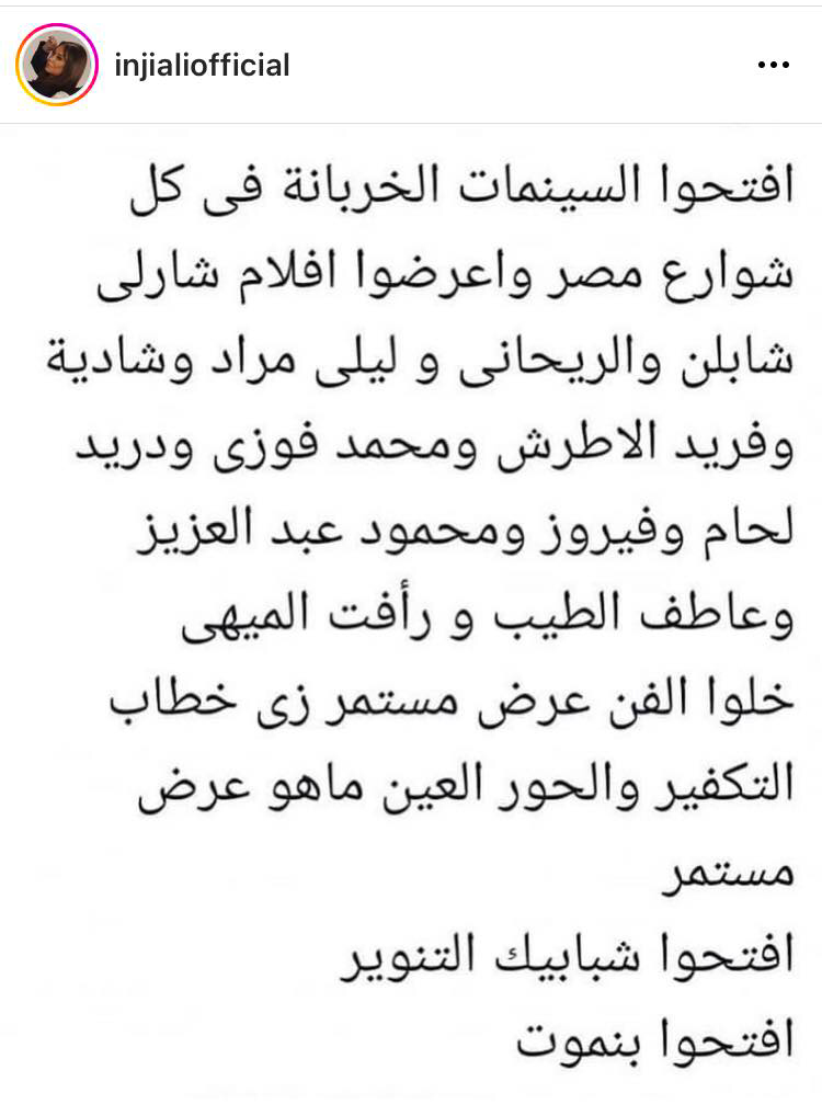 وكتبت إنجي علي عبر انستجرام: “افتحوا السينمات الخربانة في كل شوارع مصر واعرضوا افلام شارلي شابلن والريحاني وليلى مراد وشادية وفريد الأطرش ومحمد فوزي ودريد لحام وفيروز ومحمود علد العزيز وعاطف الطيب ورأفت الميهي خلوا الفن عرض مستمر زي خطاب التكفير والحور العين ماهو عرض مستمر، افتحوا شبابيك التنوير، افتحوا بنموت”.
