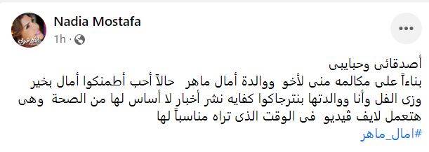 وكتبت الفنانة نادية مصطفى في منشور لها عبر صفحتها الرسمية بموقع التواصل الاجتماعي فيسبوك: «أصدقائي وحبايبي، بناء على مكالمة مني لأخ ووالدة أمال ماهر حالاً، أحب أطمنكوا أمال بخير وزي الفل».