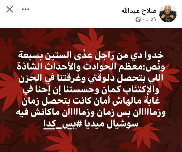 كتب الفنان صلاح عبدالله في منشور عبر صفحته الشخصية بموقع التواصل الاجتماعي «فيسبوك»: “خدوا ديه من راجل عدًَى الستين بسبعة ونُص، معظم الحوادث والأحداث الشاذة اللي بتحصل دلوقتي”.