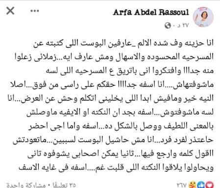 وقالت الفنانة عارفة عبد الرسول في منشور عبر صفحتها بموقع التواصل الاجتماعي فيسبوك: “انا حزينه وف شده الالم ...عارفين البوست اللى كتبته عن المسرحيه المحسوده والاسهال ومش عارف ايه”.