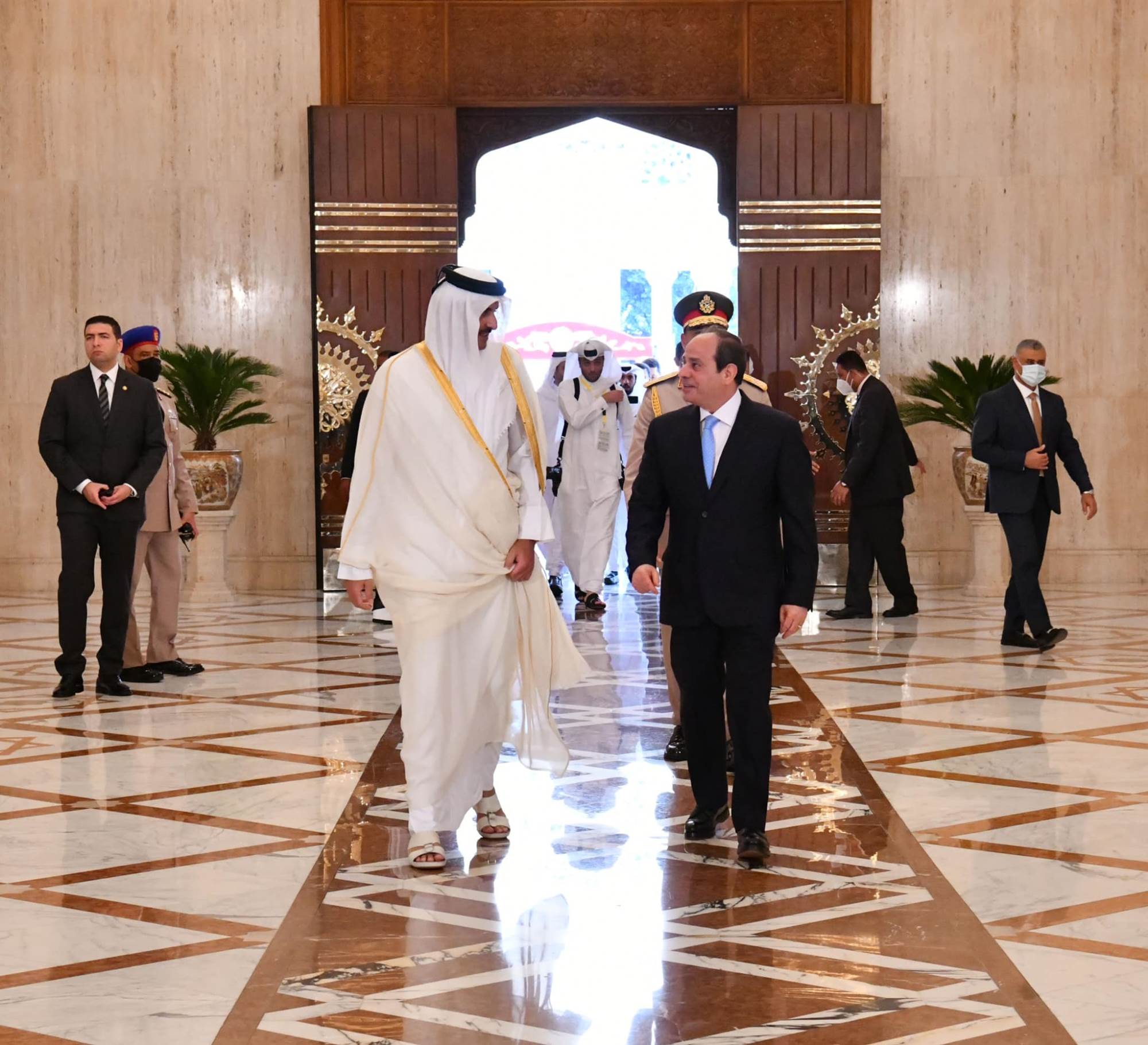 استقبل الرئيس عبد الفتاح السيسي، رئيس الجمهورية، منذ قليل، الشيخ تميم بم حمد آل ثاني، أمير دول قطر، بقصر الاتحادية، حيث أقيمت مراسم استقبال رسمية وتم عزف السلام الجمهوري للبلدين.