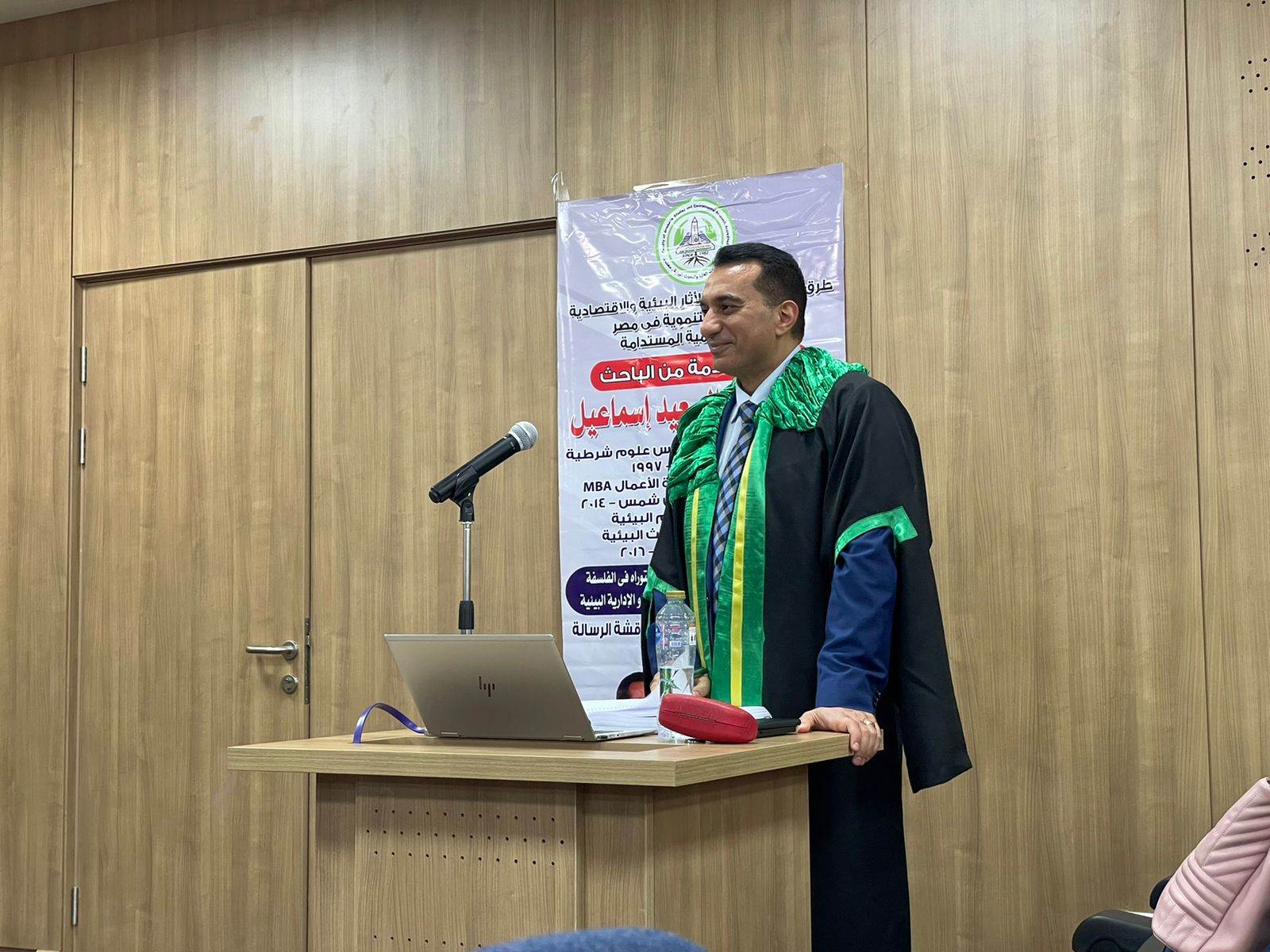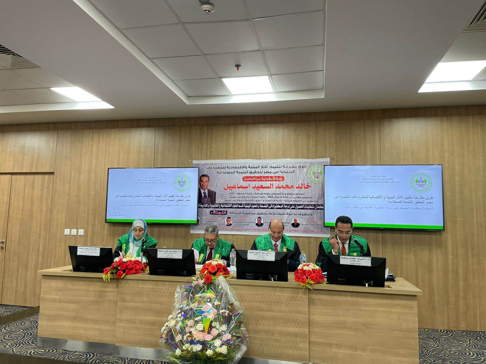 ناقش نخبه من أساتذه الاقتصاد اليوم في جامعه عين شمس أهميه تقييم الاثر البيئي والاجتماعي للعاصمه الاداريه وذلك ضمن مناقشه رساله الدكتوراه للباحث خالد محمد سعيد اسماعيل.