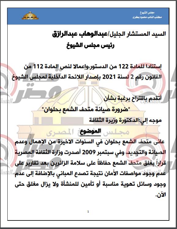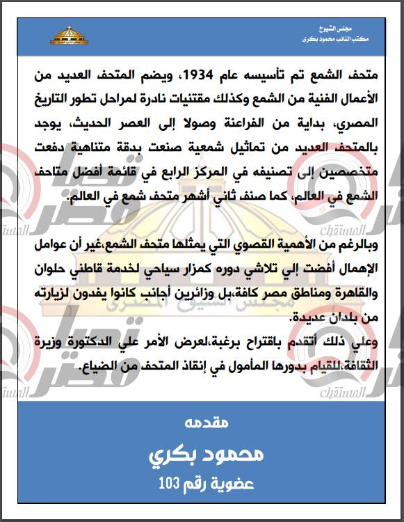 ثقافة الشيوخ تناقش مقترح النائب محمود بكري لصيانة متحف الشمع بحلوان..اليوم