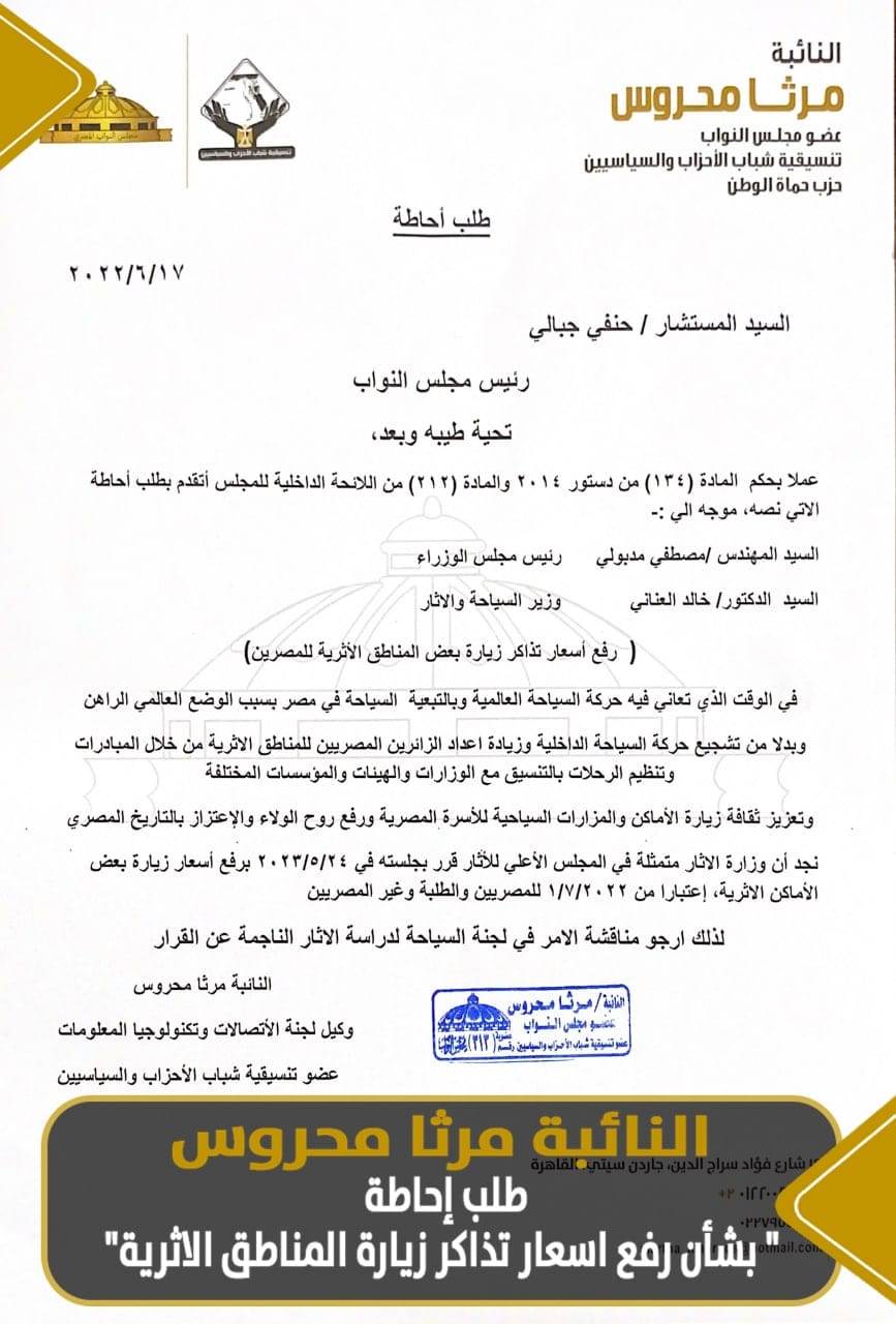 تقدمت النائبة مرثا محروس، وكيل لجة الاتصالات وتكنولوجيا المعلومات بمجلس النواب عن تنسيقية شباب الأحزاب والسياسيين لحزب حماة الوطن، بطلب إحاطة للمستشار الدكتور حنفي جبالي، موجه للدكتور مصطفي مدبولي، رئيس مجلس الوزراء، والدطتور خالد العناني وزير السياحة والآثار بشأن "رفع أسعار تذاكر زيارة المناطق الأثرية" في الوقت الذي نحتاج فيه الدعم المعنوي والمادي لزيارة هذه الكنوز المصرية وترسيخ قيم الولاء والانتماء لدى أبنائنا من خلال إدراكهم لقيمة عظمة تاريخهم واثارهم.