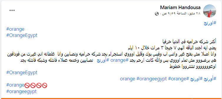 قالت عميل اورنج عبر صفحة الشركة على موقع "فيسبوك"، : "أكثر شركة حرامية في الدنيا حرفيًا يعني إية أجدد الباقة ٧ جيجا ٣ مرات خلال ١٠ أيام".