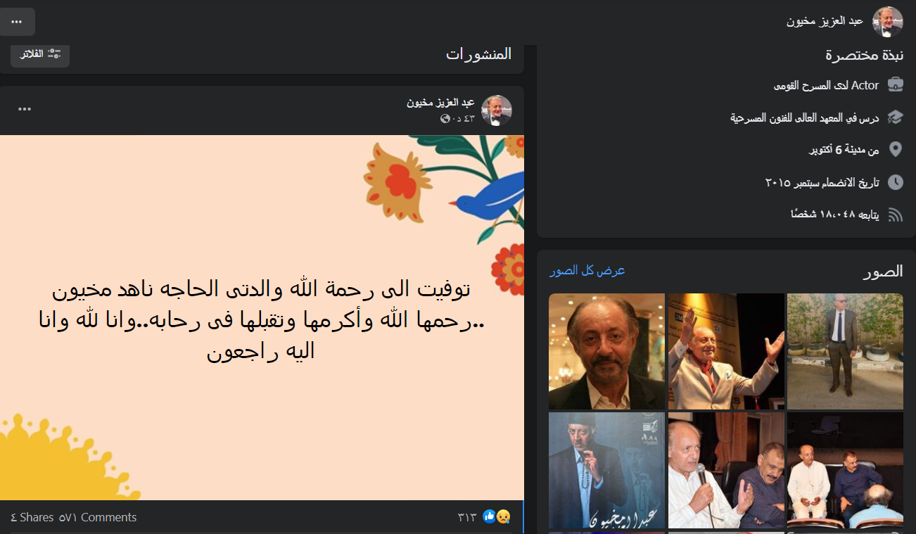 أعلن الفنان عبد العزيز مخيون عن وفاة والدته منذ قليل، وذلك عبر حسابه الرسمي بموقع التواصل الإجتماعي فيسبوك، وتفاعلت التعليقات بالدعاء للمتوفية أن يتغمدها الله في وساع رحمته.