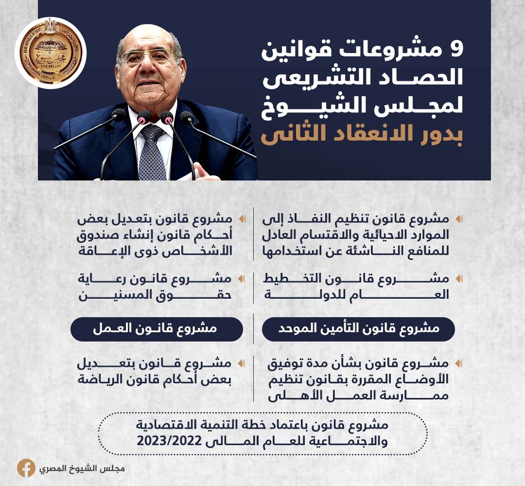 شهدت الجلسة العامة لمجلس الشيوخ، برئاسة المستشار عبد الوهاب عبد الرازق، استعراض أهم إنجازات المجلس الشتريعية والتى تضمنت قوانين التخطيط العام للدولة، التأمين الموحد، رعاية حقوق المسنين، قانون العمل، صندوق الأشخاص ذوي الاعاقة، تعديلات قانون الرياضة، تنظيم ممارسة العمل الاهلي، وخطة التنمية الاقتصادية والاجتماعية للعام المالي ٢٠٢٢/٢٠٢٣.