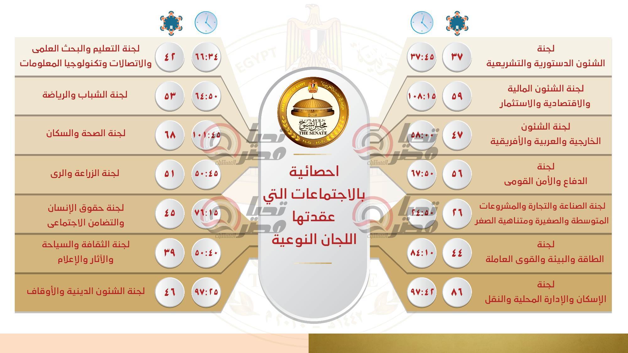 وجاء عدد اجتماعات اللجان النوعية على النحو التالي:لجنة الشئون الدستورية والتشريعية 37 اجتماعا، لجنة الشئون المالية والاقتصادية 59 اجتماعا، لجنة الشئون العربية والافريقية عقدت 47 اجتماعا، لجنة الدفاع 56 اجتماعا، لجنة الصناعة 26 اجتماعا ، ولجنة الطاقة والقوى العاملة 44 اجتماع.