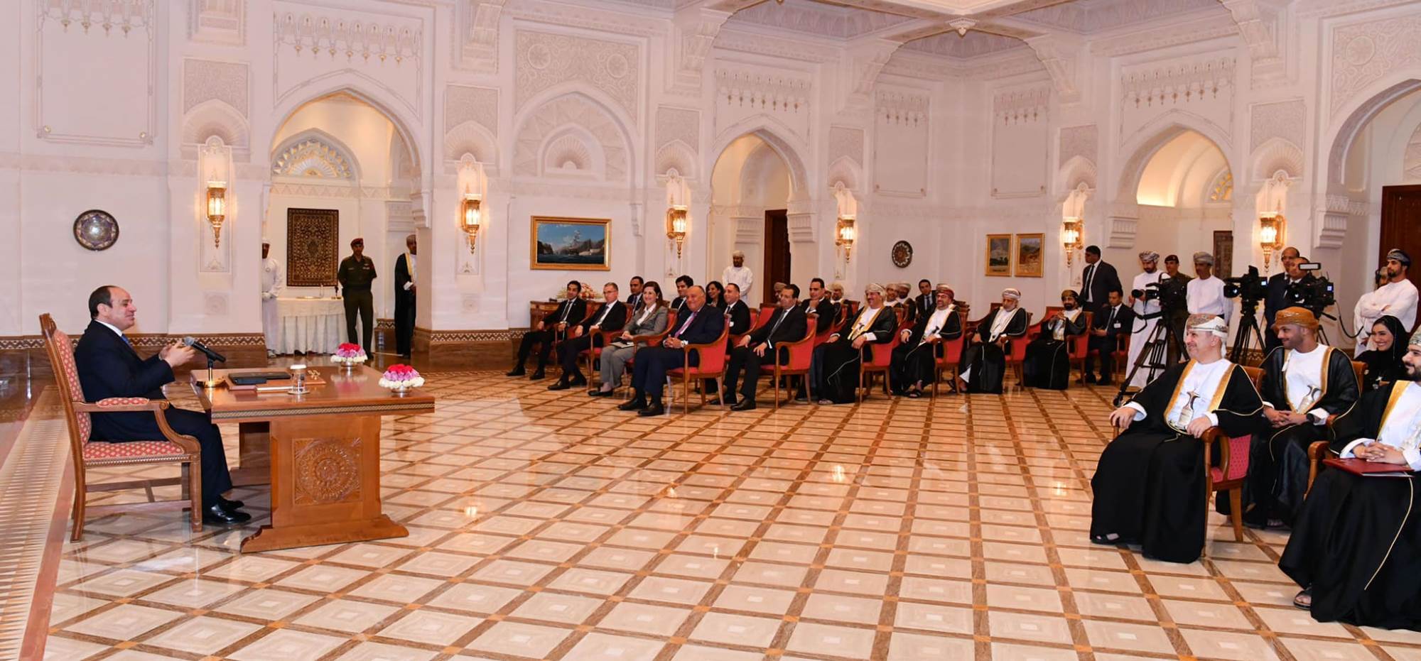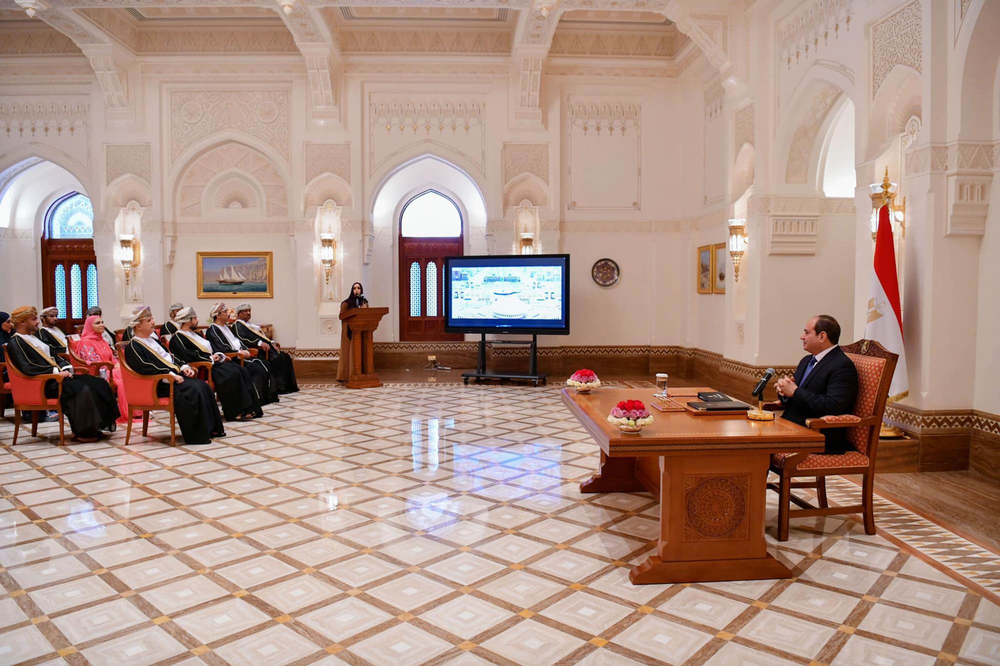 كما أشاد الحضور من الجانب العماني بالمتابعة الشخصية الحثيثة والدورية للرئيس، للإجراءات المتخذة لتسهيل تدفق الاستثمارات العمانية إلى مصر، وبالتطور والتنامي الملحوظ في الاقتصاد المصرى، والمدعوم بالجهود والإجراءات التى تتبناها الحكومة المصرية للإسراع من عملية التنمية، خاصةً مع تنفيذ العديد من المشروعات القومية العملاقة، والتي من شأنها تقديم مصر كشريك تنموي هام على الساحة الدولية.