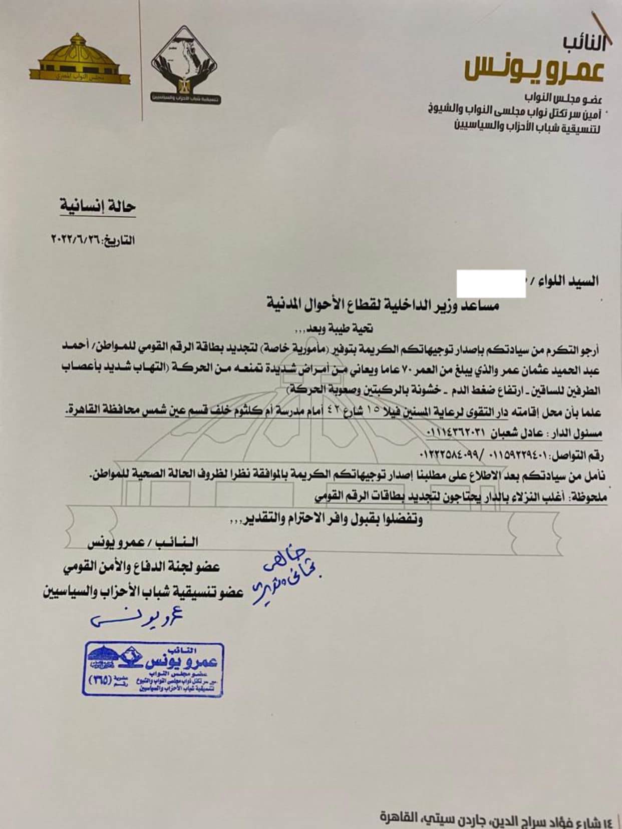 الداخلية تستجيب لـ«نائب التنسيقية» وترسل مأمورية خاصة لتجديد «بطاقة نزيل بـدار المسنين»